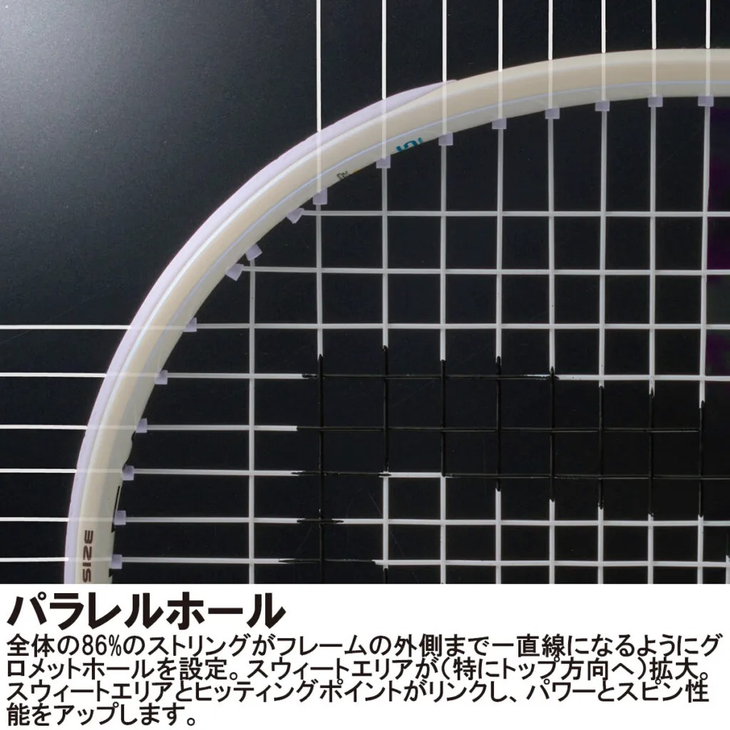 全体の86%のストリングがフレームの外側まで1直線になるようにグロメットホールを設定。スウィートエリアが(特にトップ方向へ)拡大。スウィートエリアとヒッティングポイントがリンクし、パワーとスピン性能をアップします。